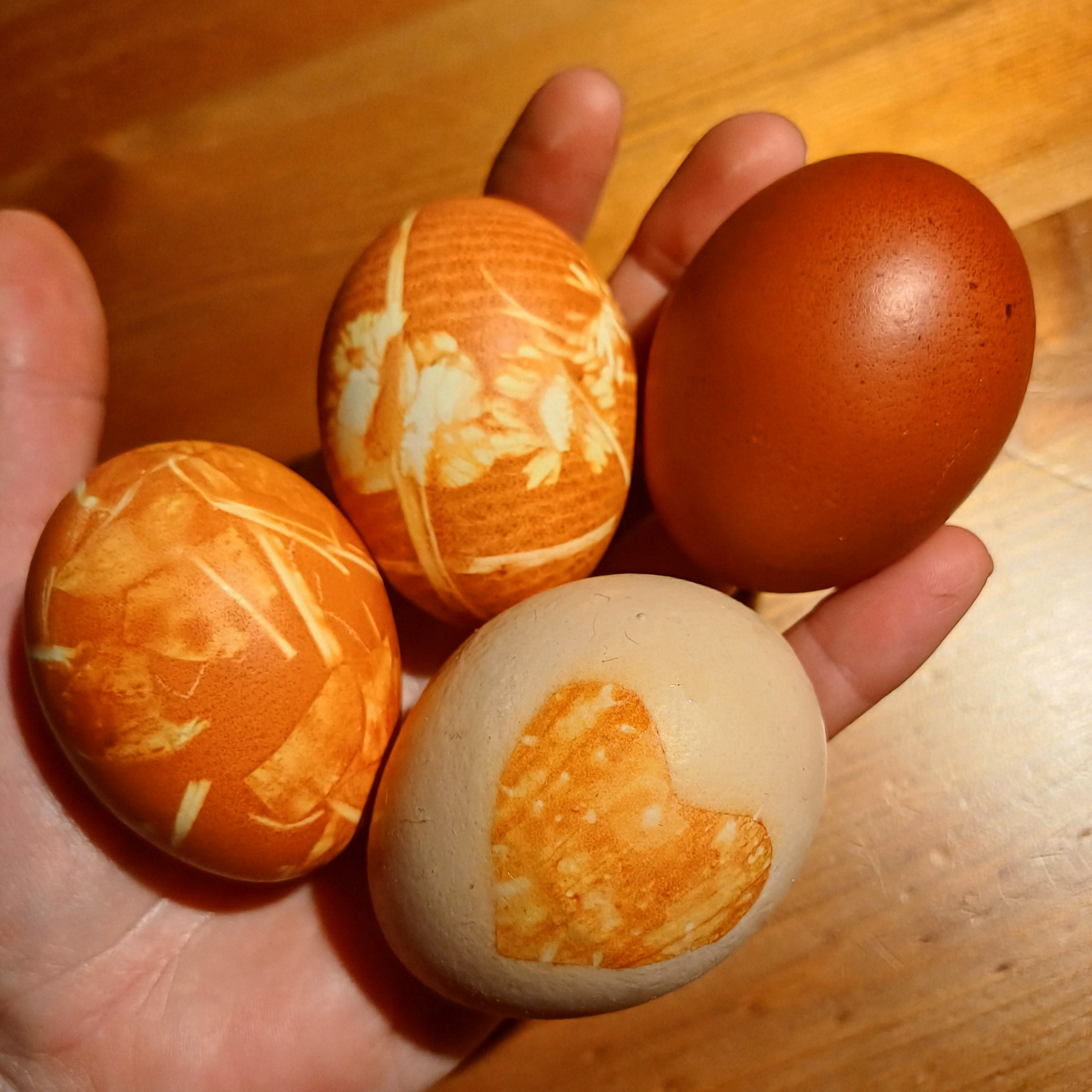 Výsledkem jsou různé odstíny přírodních barev. Každé vajíčko je jiné. Nakonec je můžeme potřít kapkou oleje, vajíčka se pak krásně lesknou a zvýrazní to barvu.